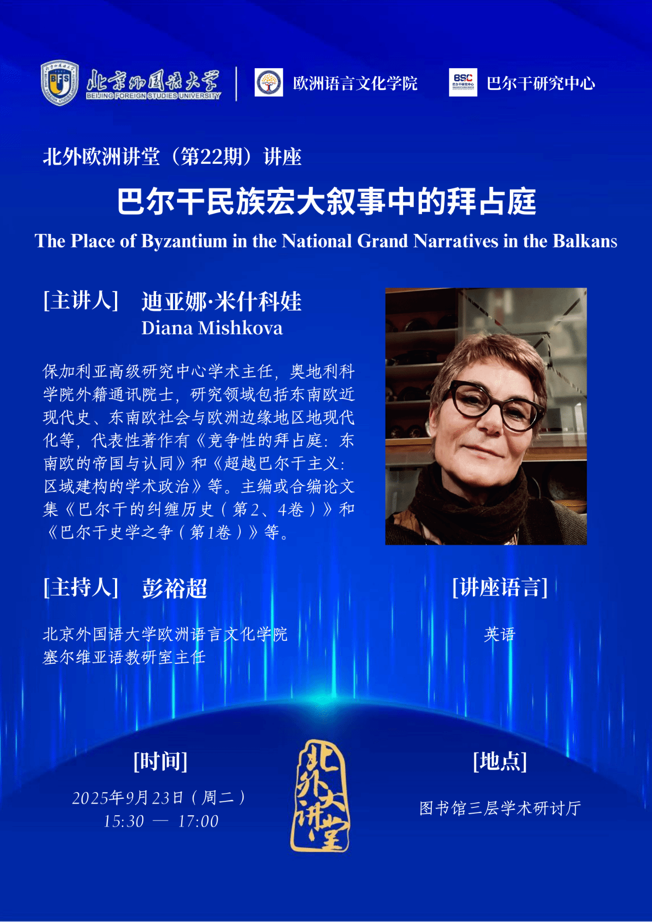 拜占庭的制度和文化影响力并没有随1453年政权崩溃而宣告终结,拜占庭遗产的连续性和形变过程仍是史学界关注的议题。罗马尼亚历史学家尼古拉·约尔加提出了著名论断——“拜占庭之后的拜占庭”,用以描述拜占庭制度与文化在东南欧持续数世纪的遗存(以1821年希腊独立战争爆发为终点)。在不同目的的政治驱动下,东南欧的拜占庭观在各历史阶段呈现出不同。与此同时,东南欧国家也因自身的地缘特性、历史背景和民族诉求而在感知、诠释与建构拜占庭遗产方面有所不同。本讲座考察地缘政治与文化背景的变迁,全面比较研究了共享拜占庭遗产的东南欧国家——保加利亚、希腊、罗马尼亚、塞尔维亚和土耳其——的史学界自启蒙运动以来对拜占庭的不同叙事。这些叙事始终处于相互对外竞争,并与域外的西方及俄罗斯学术思潮交流互动的状态。
